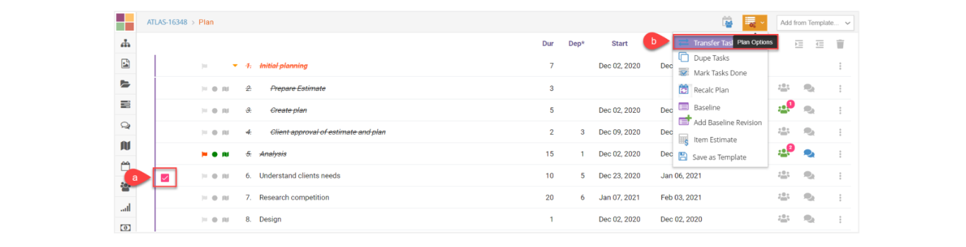 b. Click on the “Plan Options” icon and select “Transfer Tasks” on the dropdown menu.