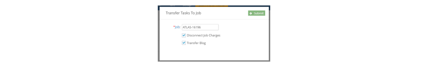 - A pop-up window will display where you can select the Job to which you want to transfer the tasks and if you want to transfer job charges and blogs attached to the task as well: